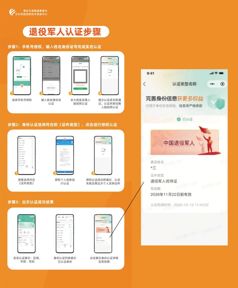 据了解,该场景是全国退役军人数据要素化重点应用场景,由景区交易数据要素化文化和旅游部技术创新中心提供技术与运营服务,并依托其研发的“景旅纵横” 微信小程序,为全国退役军人实现线上身份认证。