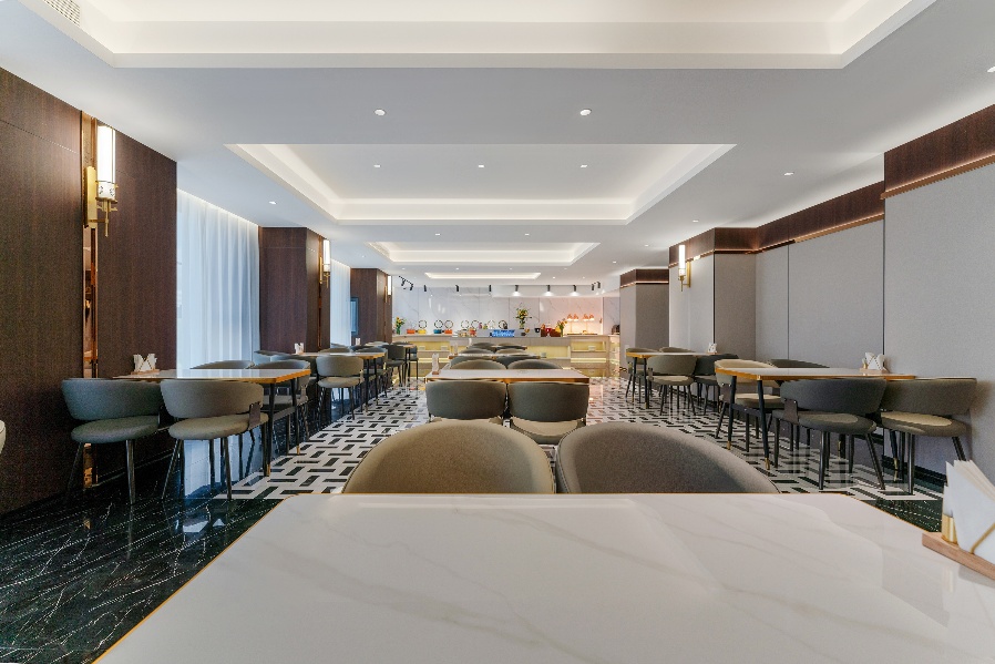 步入酒店大堂,现代雅致的氛围扑面而来。大堂设计简约大气,深色石纹地面与柔和的灯光、精致的软装交织出温馨质感。休息区摆放着柔软沙发与清新绿植,一旁的饮品吧更具巧思,营造出松弛氛围,仿佛在邀请宾客卸下疲惫,与同行者共享轻松时刻。