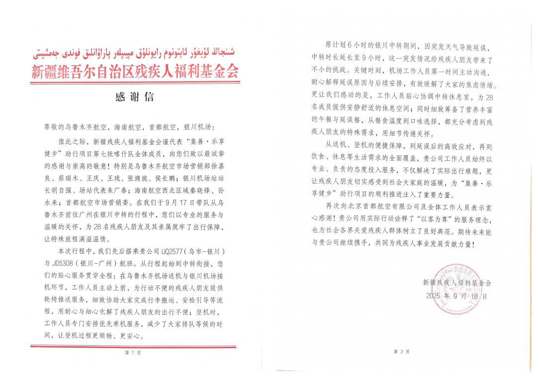 活动结束后,新疆残疾人福利基金会专门发来感谢信,对乌鲁木齐航空市场营销部徐嘉良、蔡瑞木、王庆、王珑、张旖旎、侯长鹏及协作单位的专业保障给予高度评价,称此次服务“不仅解决了实际出行难题,更让残疾人群体切实感受到社会大家庭的温暖,为‘集善・乐享健步’助行项目顺利推进注入了重要力量”。
