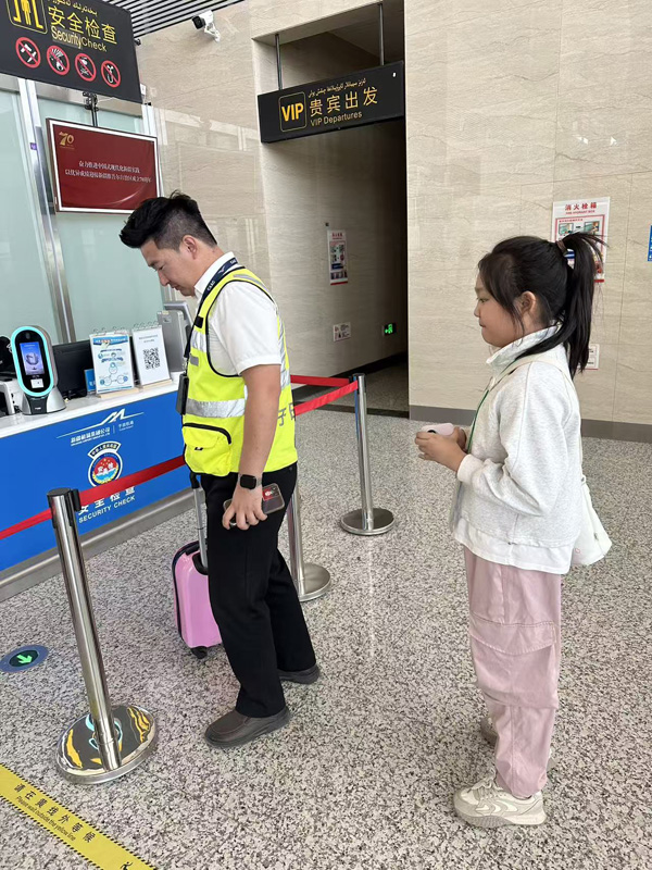 10 月 1 日上午,亚库普先生独自乘坐航班前往外地看病,且因腿部不适需要轮椅服务。工作人员见到后,立即上前帮忙提拿行李,推来已消毒完毕的轮椅。“阿达西,麻烦你了,我这腿脚不方便,还担心赶不上飞机呢!” 亚库普先生略显局促地说。“您放心,有我们在,肯定让您顺利登机!” 工作人员一边安抚情绪,一边推着轮椅为他办理值机、行李托运,全程耐心讲解流程,让紧张感渐渐消散。