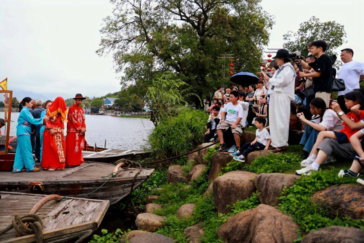 图片加载中…当然,更重磅的民俗表演要属“九姓渔民水上婚礼”了。作为浙江省非物质文化遗产项目,这项民俗表演全程在江面的乌篷船上进行,新娘坐红盆“抛”过船、拜堂等仪式都别具特色。现场,身着传统服装的新郎、新娘还热情地与游客们互动,营造出了一个个氛围小高潮,让游客们得以沉浸式地感受这一独特的婚俗文化。