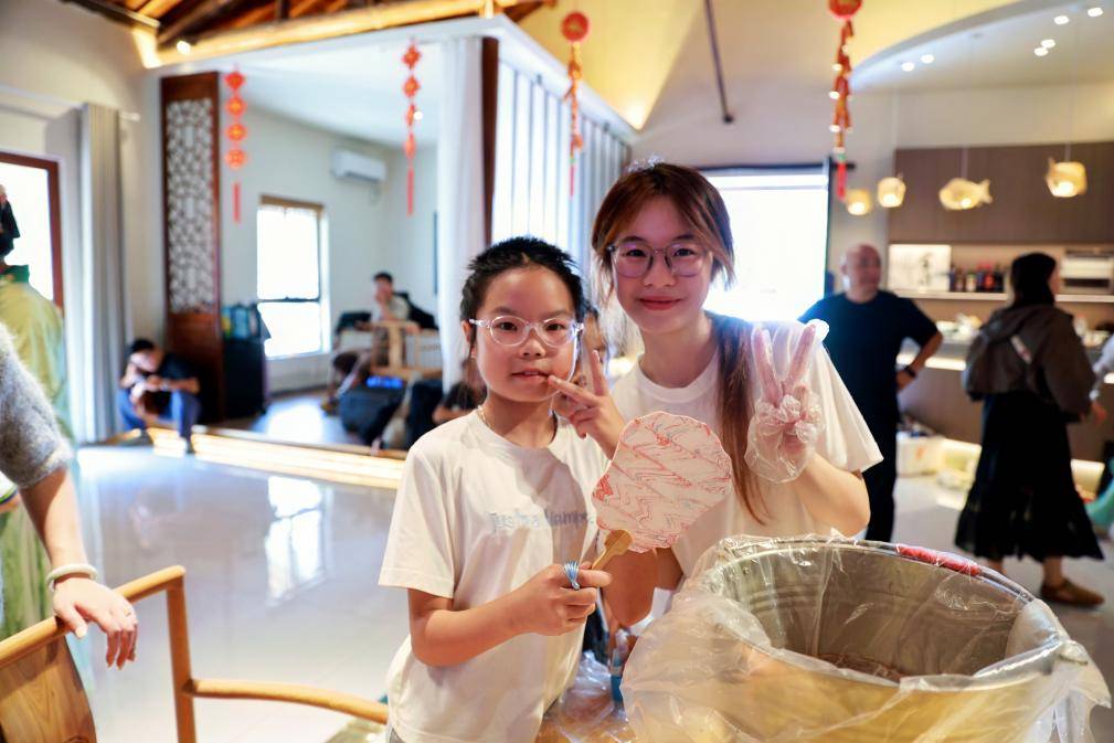 在三都渔村文化礼堂内,非遗体验区人气爆棚。在漆扇展区,非遗传承人现场示范了漆绘等漆扇制作环节,游客们的兴趣也被调动了起来,纷纷参与其中,从调配漆色、浸润扇面,再到轻晃扇面勾勒独特纹样,他们都专注十足,做出来的成品也令人赏心悦目。