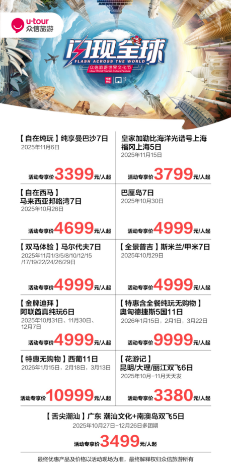 作为中国领先的旅游综合服务商,众信旅游首次整合全球顶级旅游资源,携手全球多国旅游局及合作伙伴,强势打造“闪现全球”这一独家活动IP,将世界风情呈现至游客身边,为旅游圈层注入全新活力,引爆新一轮的旅行风潮。