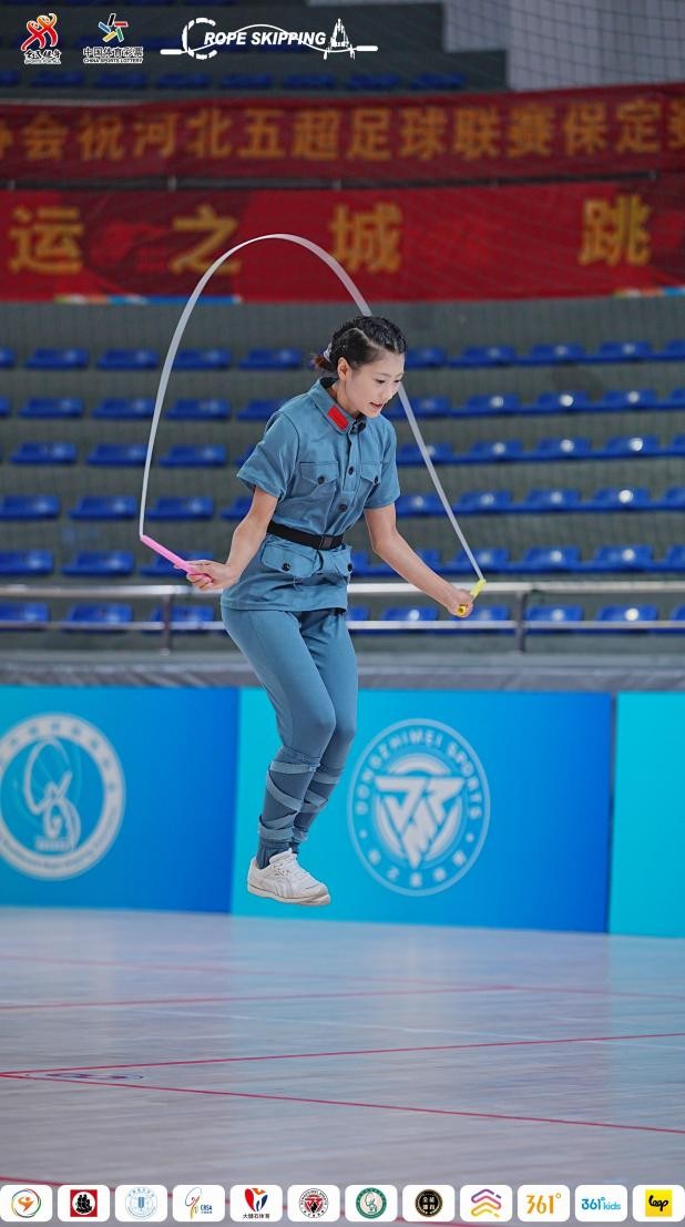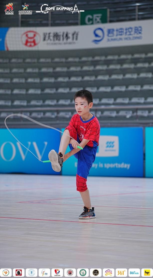 3分钟单摇跳是对选手速度与耐力的双重考验,吉林省吉林市炫乐动跳绳俱乐部的赵一桐在长时间落后的情况下最终实现翻盘,以1105次的优异成绩夺冠。在考验团队默契的1分钟10人长绳集体跳中,陕西省西安市长安区跳绳队的10名选手以157次的成绩笑到最后。