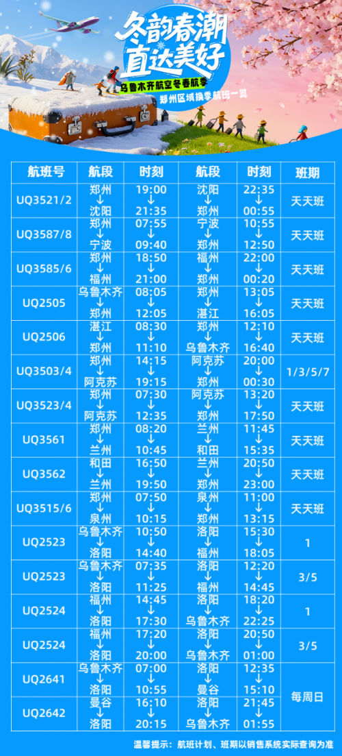 持续运营的郑州=兰州=和田(每日一班)、郑州=泉州(每日一班)、乌鲁木齐=洛阳=福州(每周1/3/5)航线,紧紧筑牢中原与西北边疆、东南沿海的空中纽带;郑州=阿克苏航线在每日一班基础上,新增每周1/3/5/7执飞航班,实现班期加密。此外,乌鲁木齐=洛阳=曼谷国际航线将由每周一调整为每周日执行一班,进一步便利豫泰两地人员往来与文旅商贸合作。