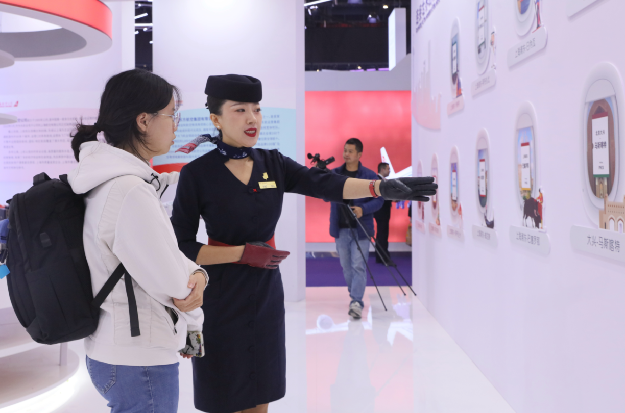 步入东航展台,首先映入观众眼帘的,是一面醒目的国际航线展示墙。近年来,东航坚持“往远处飞、往国际飞、往新兴市场飞”的战略导向,密集新开多条国际航线。此次,东航重点推介了2025年起新开的阿布扎比、日内瓦、巴塞罗那、哥本哈根、布宜诺斯艾利斯等12条国际航线。东航将上述目的地的地标性建筑创意性地嵌入飞机舷窗的造型中,使观众在观摩时,宛如置身云端的东航客舱,透过舷窗逐一欣赏不同城市的标志性天际线。