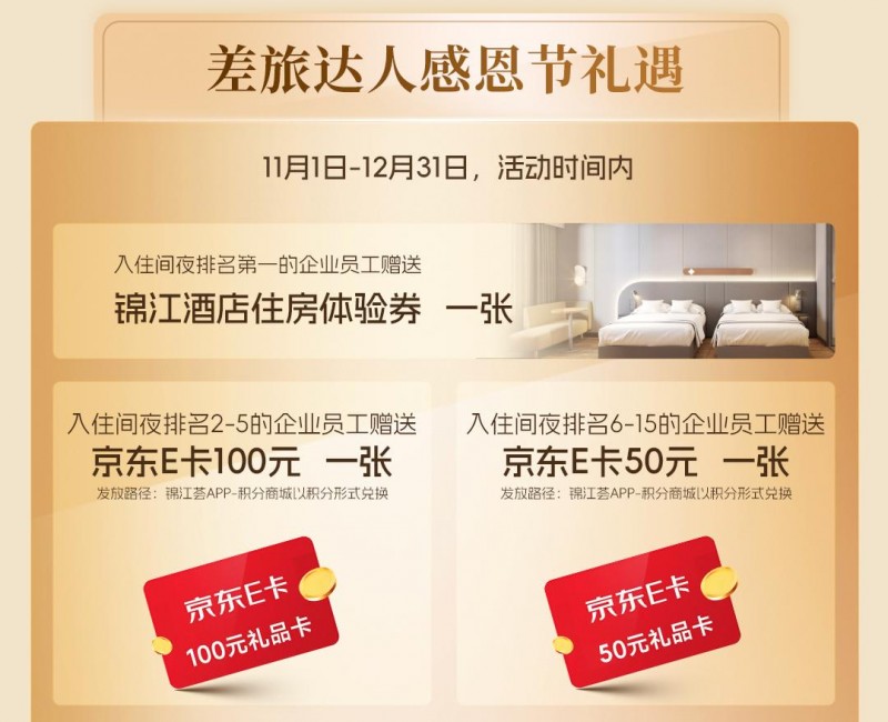 11月1日-12月31日,锦江酒店商旅感恩福利季温情启幕!低折礼遇、入住好礼、企业专属回馈……这一次,让差旅不止高效,更有温度。