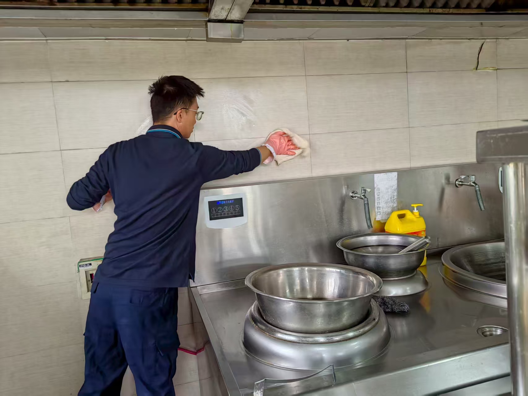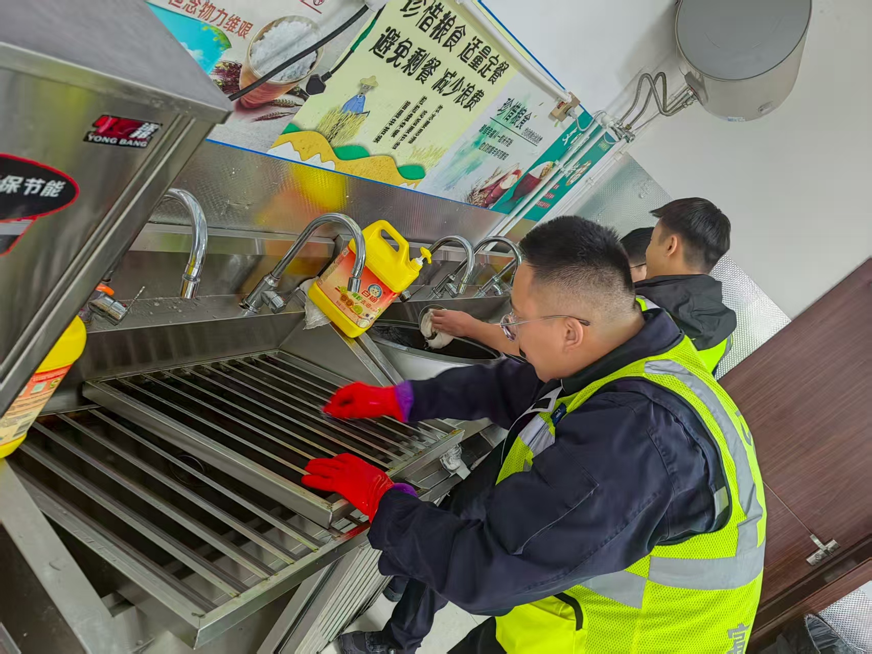 本次卫生大扫除以 “全覆盖、无盲区、无死角” 为目标,划定四大重点清洁区域,确保清洁工作精准落地。一是操作区深度清洁,重点对灶台、蒸箱、烤箱等烹饪设备进行拆卸式清理,清除设备内部油污、食物残渣,对刀具、菜板等厨具进行高温消毒,二是储物区规范整理,对食材仓库进行全面盘点,分类整理米面油、干货、调味品等物资,检查食材保质期,清理过期、变质原料,同时清洁货架、地面及通风设施,防止霉菌滋生,三是就餐区彻底清扫,对餐桌椅、地面、门窗、照明设备进行擦拭清洁,使用消毒剂对餐桌表面、门把手等高频接触部位进行消杀,更换破损餐具,规整就餐区物品摆放,四是排污及附属设施清洁,疏通排水沟、清理隔油池,清除管道内油污及杂物,对食堂排烟系统、通风设备进行全面清洗,确保设施正常运转,消除卫生隐患。
