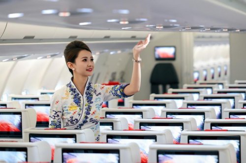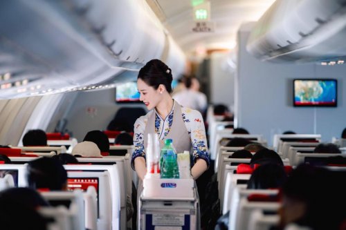 附图5:海南航空乘务员在全新空客A330飞机经济舱服务中(王峻权 摄)