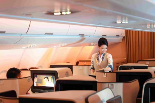 附图4:海南航空乘务员在全新空客A330飞机公务舱服务中(吴佳奇 摄)