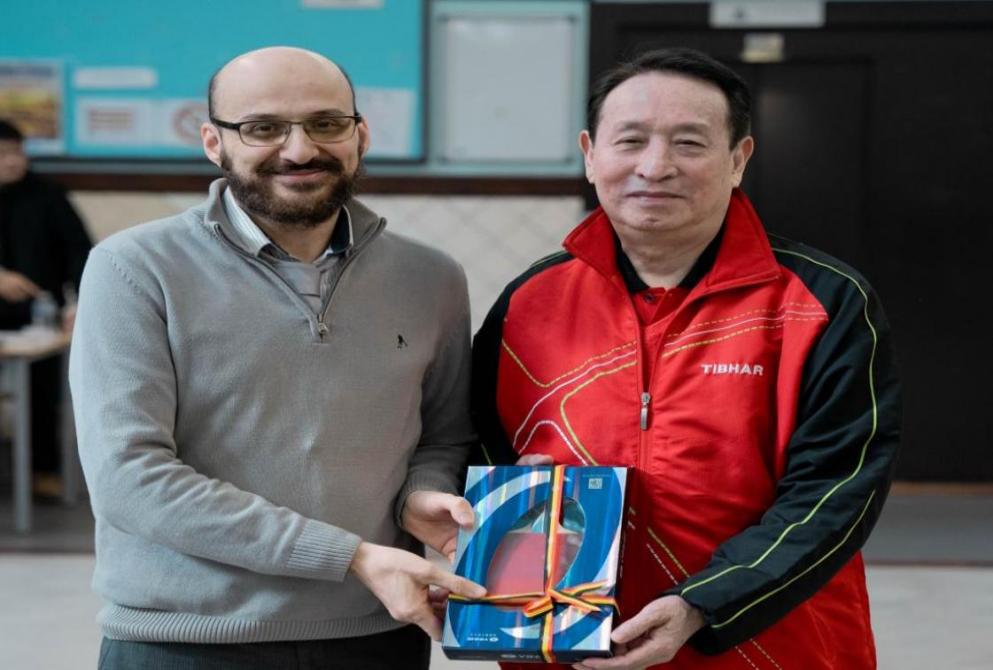 附图1:比利时前国家队主教练王大勇向学校赠送专业训练球拍