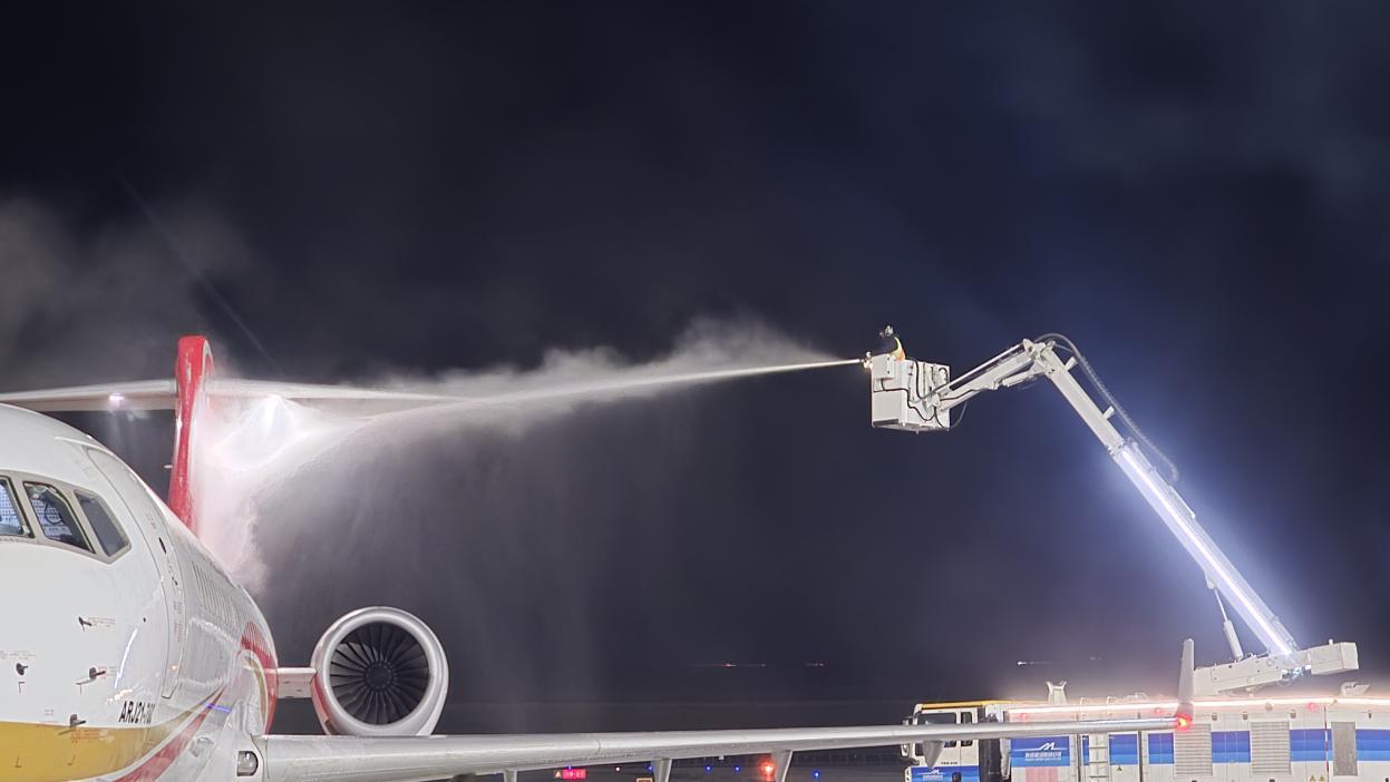 清晨7时许,机场机坪温度已降至零下10摄氏度,航前航空器机身表面出现明显霜冻。机场运行指挥中心依据天气预警及检查结果,迅速启动除冰预案。两辆大型专业除冰车进入作业位置,地勤人员严格按照规程,对飞机机翼、机身等关键部位进行喷射除冰液作业。整个过程紧张有序,约10分钟后,飞机达到安全放飞标准,准时执行出港航班。