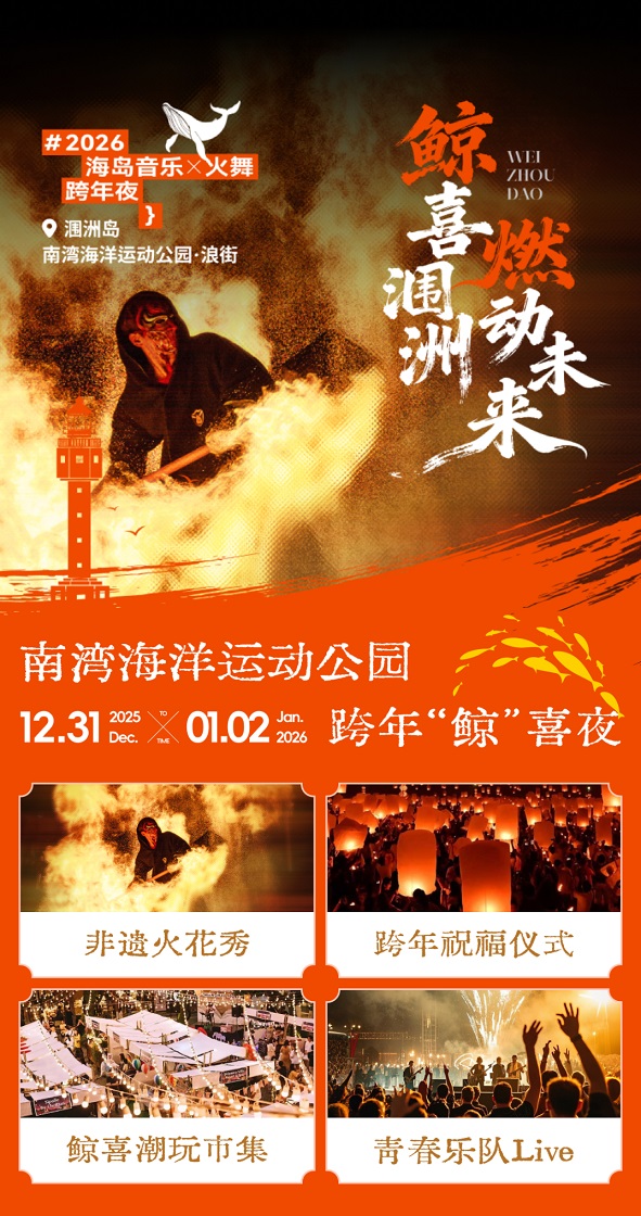 夜幕降临后,活动迎来高潮。多轮精湛的非遗火舞表演将纷纷亮相,打铁花、喷火、火刀、火壶、风火轮等传统技艺,在夜色中展现力与美的震撼对话。同时,“涠洲音浪・海岛Live派对”将以音乐为媒,营造热烈愉悦的节日氛围。12月31日零点,岛上还将举行专属“跨年点火仪式”,游客可共同参与传统祈福活动,在璀璨星空下共同迎接2026年到来。