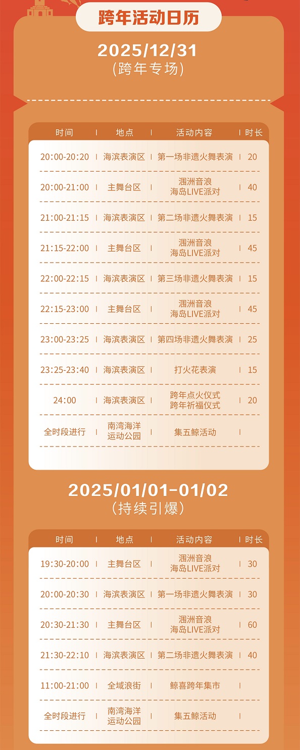 据介绍,本次元旦活动的设计充分考虑了不同时段、不同群体的需求。活动期间,南湾海洋运动公园将全天开放互动体验区,游客可以参与多种主题游戏,并在活动当天享受“抽奖机会翻倍”等特别福利。此外,浪街还有"鲸喜跨年市集"汇集了来自世界各地的特色手工艺品、本土手作创意产品以及海岛特色美食,为游客提供丰富多元的游览与购物体验。