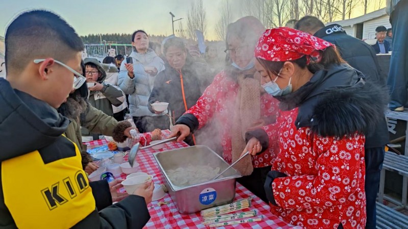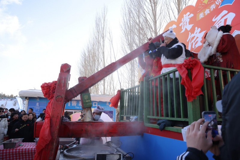 开幕式现场亮点纷呈,热力十足。热场节目《福到好运来》与体彩红包雨点燃全场气氛;滑雪特技微短剧《塞外和鸣》展现了冰雪运动的速度与激情;鼓舞表演《万马奔腾越雪原》奏响草原豪情;歌舞秀《冰雪新天地》绽放冬日浪漫。活动现场还深度融合了丰富的消费与互动体验:“九转烟火・冰雪饭局”美食区香气四溢,开锅饺子宴中藏有惊喜大奖;千人共享的富贵饸饹面开锅仪式热闹温暖;特色运菜队伍沿途互动,派送新鲜果蔬;“九大福星”NPC引领游客进行趣味打卡挑战,赢取各类奖励。晚间,“冰雪燃情”环节的烟花瀑布与篝火晚会将热烈氛围推向高潮。