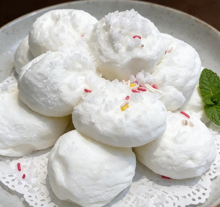 视觉:通体雪白,蓬松绵软,形如一个个毛茸茸的雪球或云朵堆叠盘中,自带仙气。