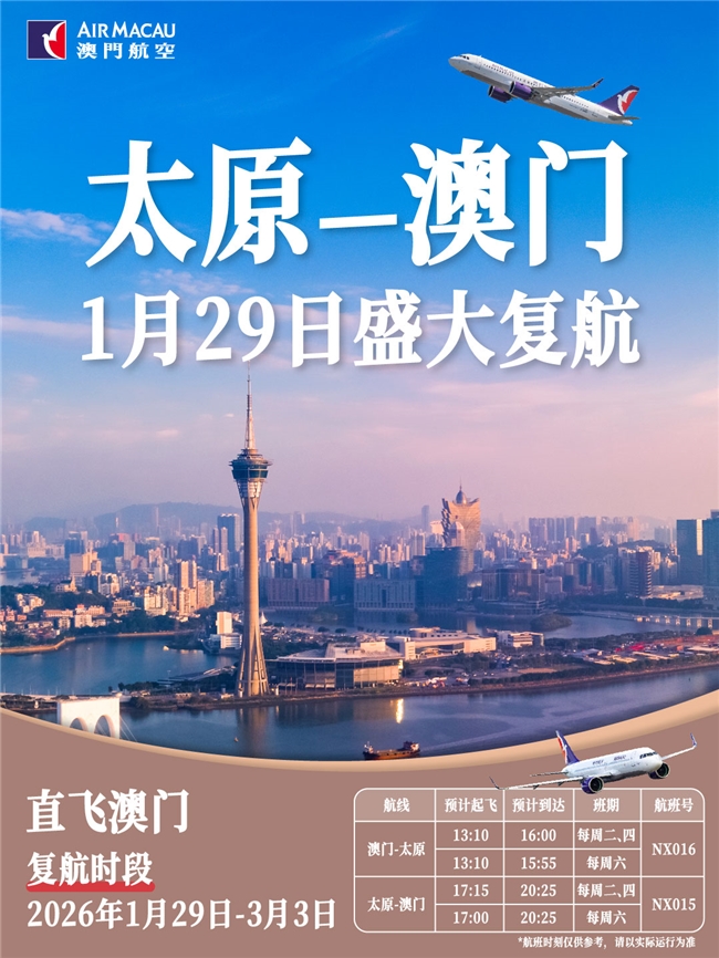 澳门航空计划于2026年1月29日至2026年3月3日期间,恢复太原武宿国际机场至澳门的直达客运航班,班期为每周二、四、六,具体航班时刻: