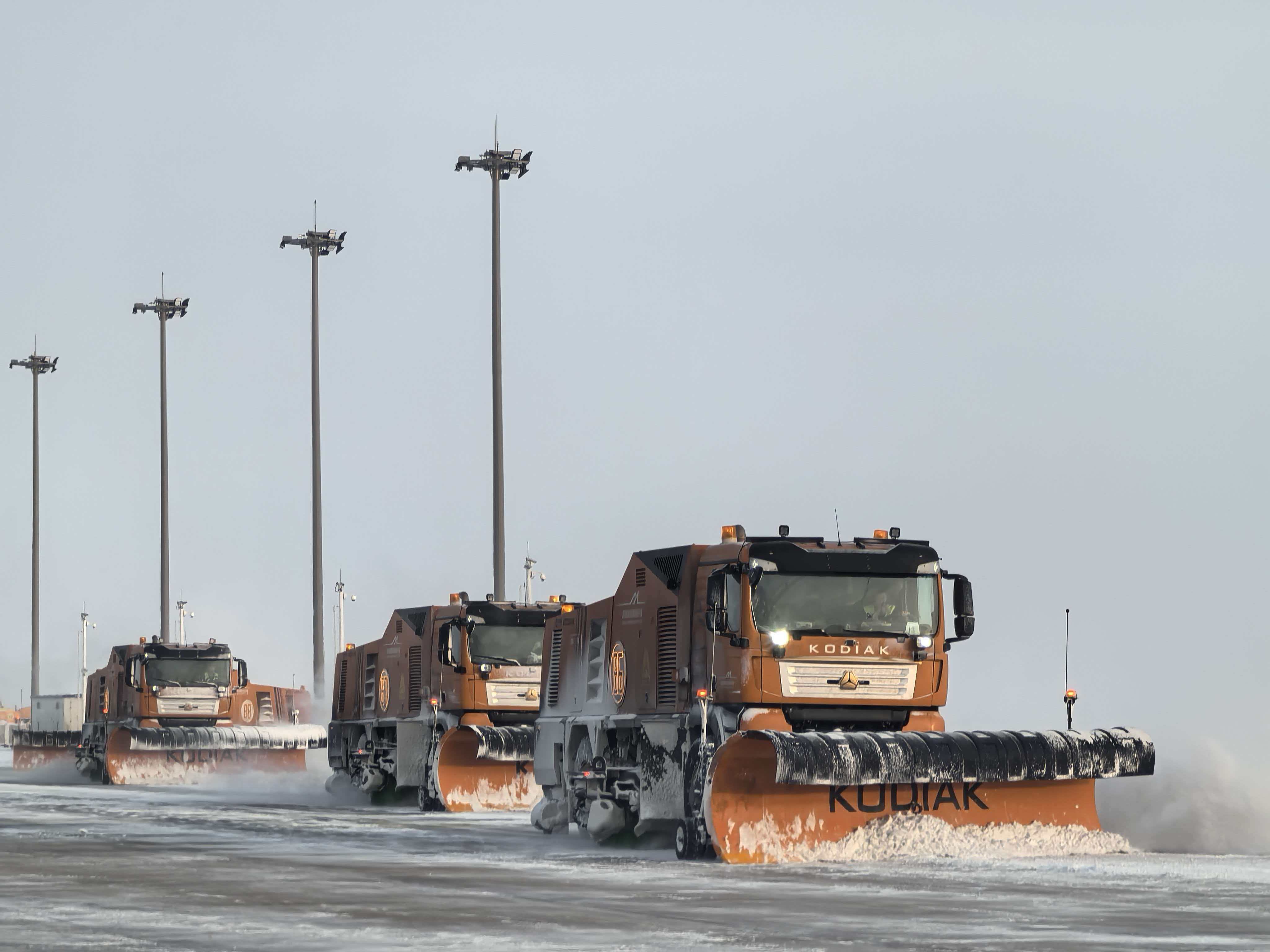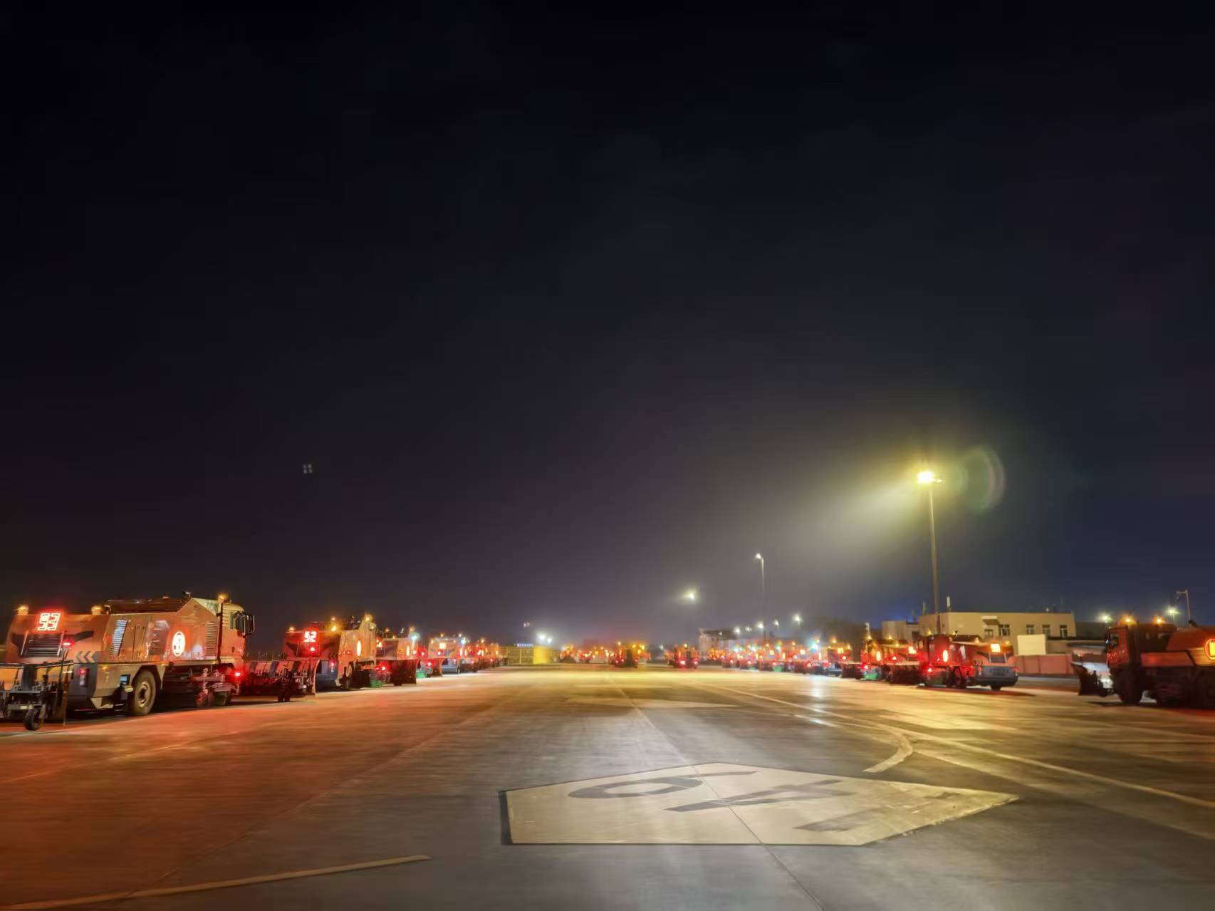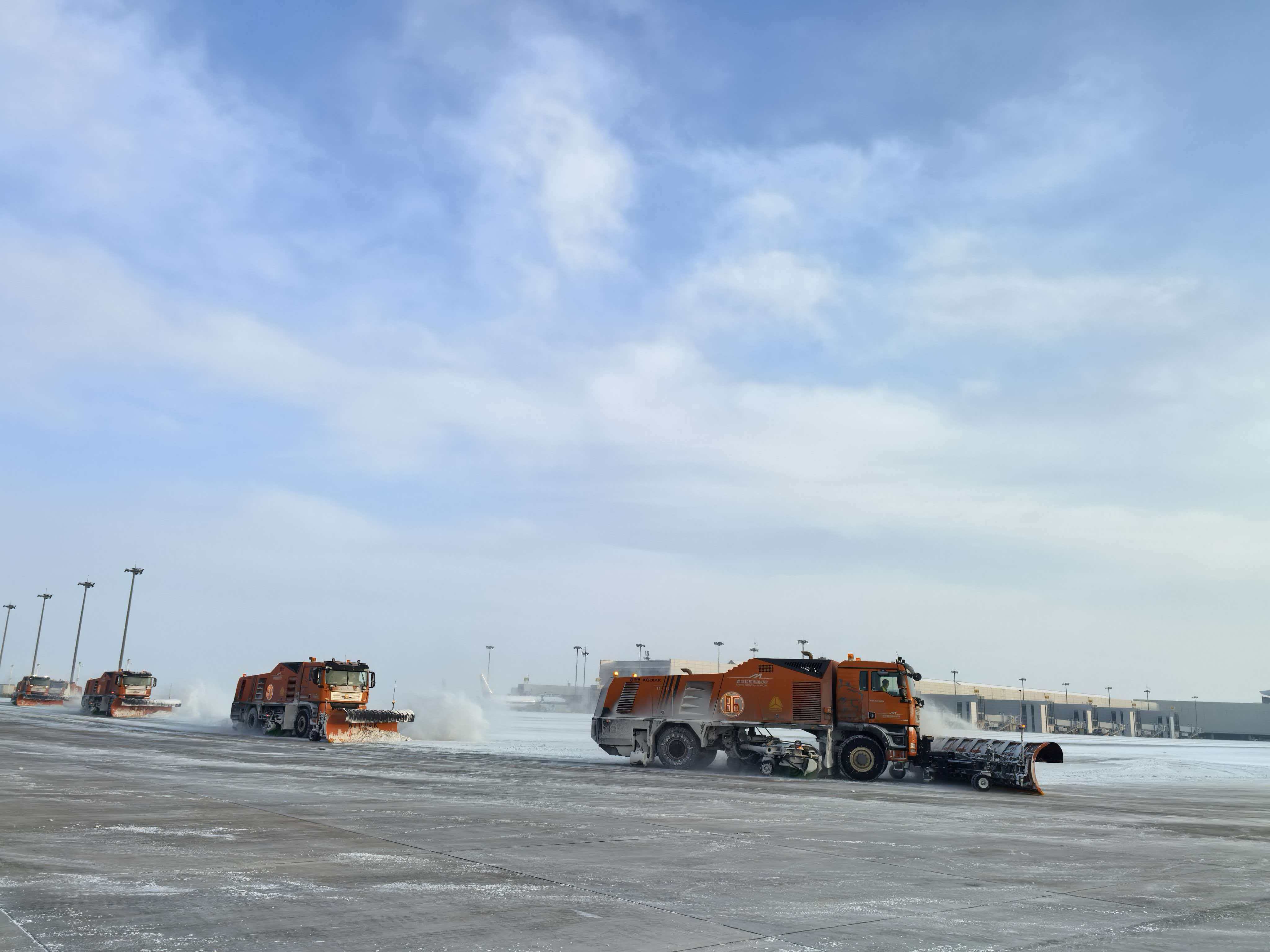 飞行区管理部科学调度扫雪车、吹雪车、除冰液洒布车、摩擦系数测试车等110余台特种专业设备,编组作业,采取“人机结合、即下即清、循环推进”的作业模式,按照优先保障跑道、随即贯通滑行道、同步清理机坪的关键区域的顺序,在茫茫雪海中劈波斩浪。全体保障人员不畏严寒,昼夜轮班奋战在零下十余度的机坪上,实现“人歇机不停”。截至17日13时,累计出动车辆372车次、出动人数388人次。
