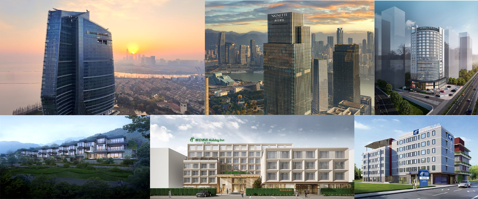 上排从左至右:湖州南太湖洲际酒店、洲至奢选重庆TFT酒店、合肥中心尚都筑格酒店