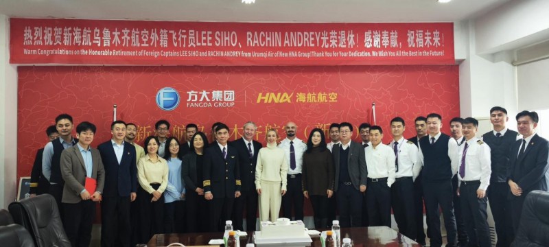 中国航空旅游网讯www.cnair.com (通讯员 杨君)2026年1月16日,新海航乌鲁木齐航空举行了一场温馨而庄重的退休仪式,向服务公司长达十年的外籍机长李时昊(LEE SIHO)与拉琴·安德烈(RACHIN ANDREY)致以诚挚感谢与崇高敬意。公司领导、员工代表、飞行员家属及友人齐聚一堂,共同见证这一充满温情与意义的时刻。