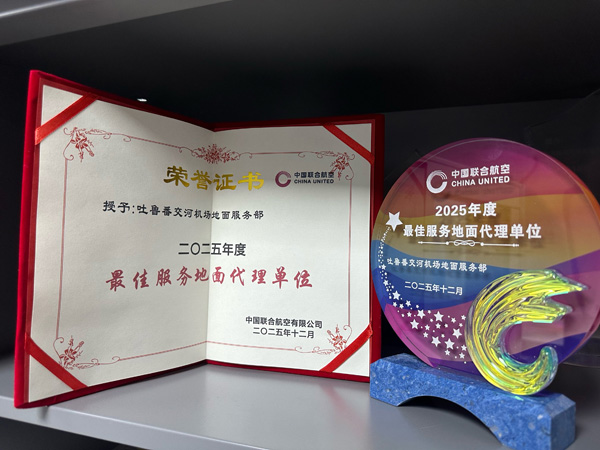 中国航空旅游网讯www.cnair.com 1月22日,中国联合航空股份有限公司授予吐鲁番交河机场“最佳服务地面代理单位”荣誉称号,以表彰其在地面保障服务、航班运行支持、旅客体验提升等方面的卓越表现。此次授奖不仅是对吐鲁番机场地面服务品质的高度认可,更是双方深化丝路航线合作、共推航空旅游融合发展的重要里程碑。