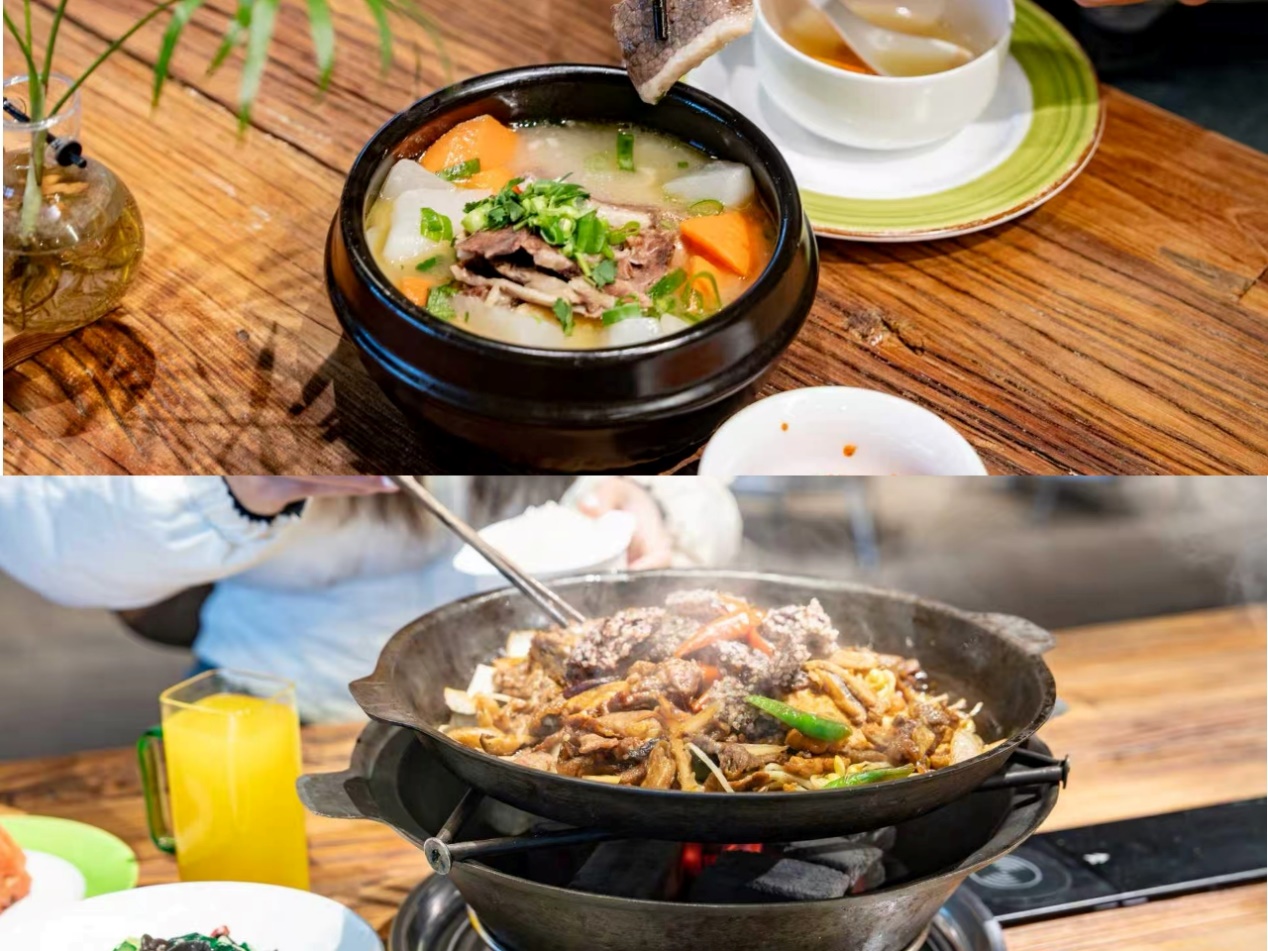 此外,餐厅也提供多种充满锅气的热食选择。如源自延吉的延吉高丽火盆,可边烤边吃;朝鲜族辣白菜五花肉,融合酸辣与焦香;以及暖胃的牛肉汤饭。