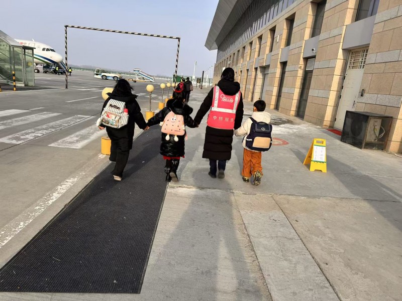 这组旅客是从本地返乡的无陪儿童且携带行李较多,机场地面服务部主动开启“爱心传递”服务。从旅客进入航站楼的引导、协助托运行李,到陪伴通过安检、直达登机口,再到机坪上的全程牵手护送,工作人员提供了“一站式”无缝衔接服务,最大限度减少了流程的繁琐与等待时间。