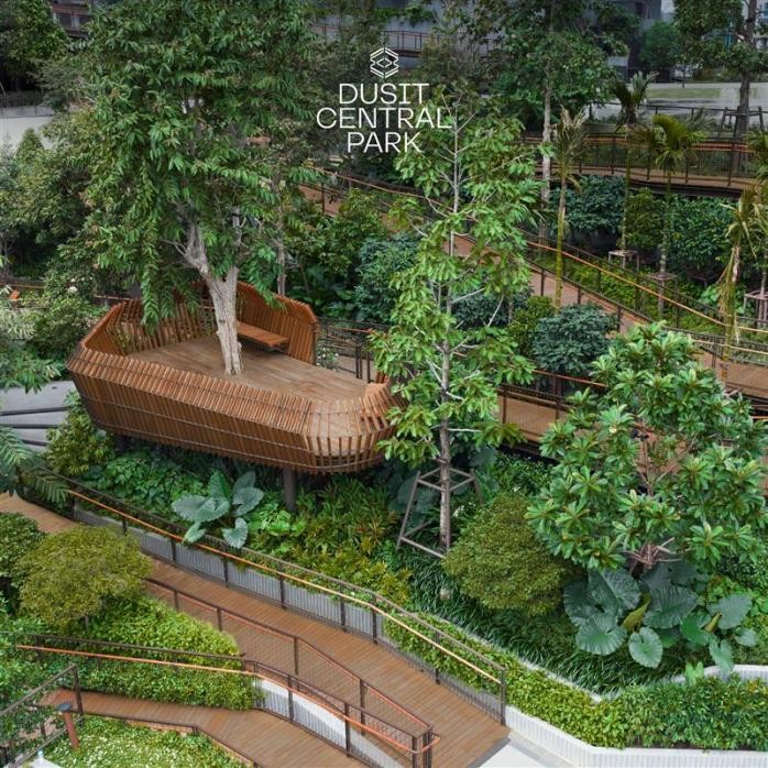 项目中最具标志性的公共空间之一,是向公众开放的 Dusit Arun Park。这是一座位于综合体上方的大型空中公园,占地逾万平方米,是泰国规模最大的城市屋顶公园。公园整体以“城市绿洲”为理念,规划了多条步行路径、观景平台、草坪与休憩空间,并通过大量热带植物景观,弱化高密度城市带来的压迫感。依托立体景观设计,公园将城市、自然与人重新连接在一起。
