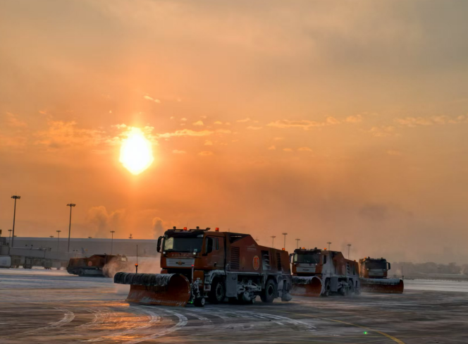 从29日凌晨7时起,机场出动多功能除雪车、除冰液洒布车、摩擦系数测试车、热吹车等大型专业设备,按照“跑道、滑行道、机坪”的优先级顺序,对机场飞行区道面进行持续清扫、除冰作业。利用航班间隙,对机场关键运行区域实施了集中攻坚。作业过程中,场务人员与空管塔台紧密协同,实时监控道面状况,确保符合起降标准。