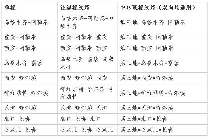 本次政策适用于目的地为阿勒泰、富蕴、哈尔滨、长春四地的单程、往返、中转联程航班,适用航线涵盖天津=哈尔滨、乌鲁木齐=阿勒泰、重庆=阿勒泰、西安=阿勒泰、呼和浩特=哈尔滨、海口=长春、石家庄=长春等多条热门线路,中转联程则支持第三地经天津、乌鲁木齐、重庆、西安、海口、石家庄等中转地往返上述四个冰雪目的地,活动期间如有其他新开的相关航线也将同步适用。天津航空相关负责人解释道:“我们这项服务政策兼顾了直飞与中转旅客的需求,对于往返程分开购票的旅客来讲,只要符合我们的政策线路,以及前往阿勒泰、富蕴、哈尔滨、长春的航班日期在前,也可以享受雪具免费托运的服务。”