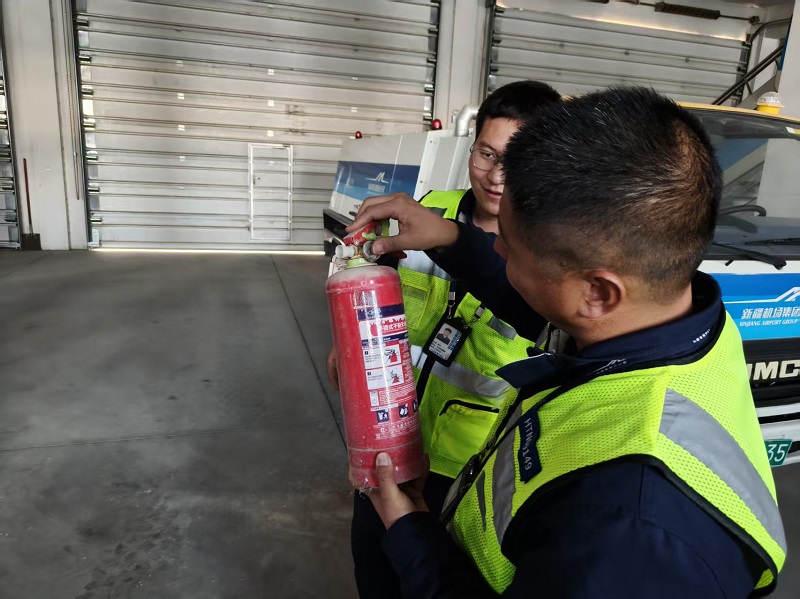 结合新能源车辆电池火灾的扑救特点,消防人员还以此次检查为契机,对机场车辆运维人员、驾驶员开展“以查代训”实操教学,现场演示水基灭火器针对新能源车辆初期火灾的使用技巧,讲解电池热失控的预警特征与应急处置流程,将消防安全检查与实操培训深度融合,既夯实了硬件设施的安全基础,又提升了一线人员的应急处置能力。