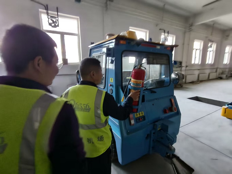 此次检查正值冬季严寒时期,本次专项检查以机场新能源通勤车、地勤作业车等各类新能源车辆为核心排查对象,航空安全保卫部(消防救援站)消防人员深入机场车辆运维库、停机坪作业区等重点区域,对车辆配备的水基灭火器进行“全覆盖、无死角”查验。