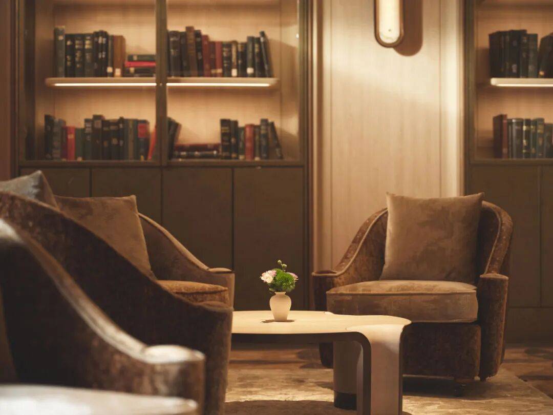 大堂空间一半被设计为阅读区,书架上陈列着精选的法国原版古典书籍;灵感源于巴黎歌剧院的弧形卡座,提供半私密的“安全感”。