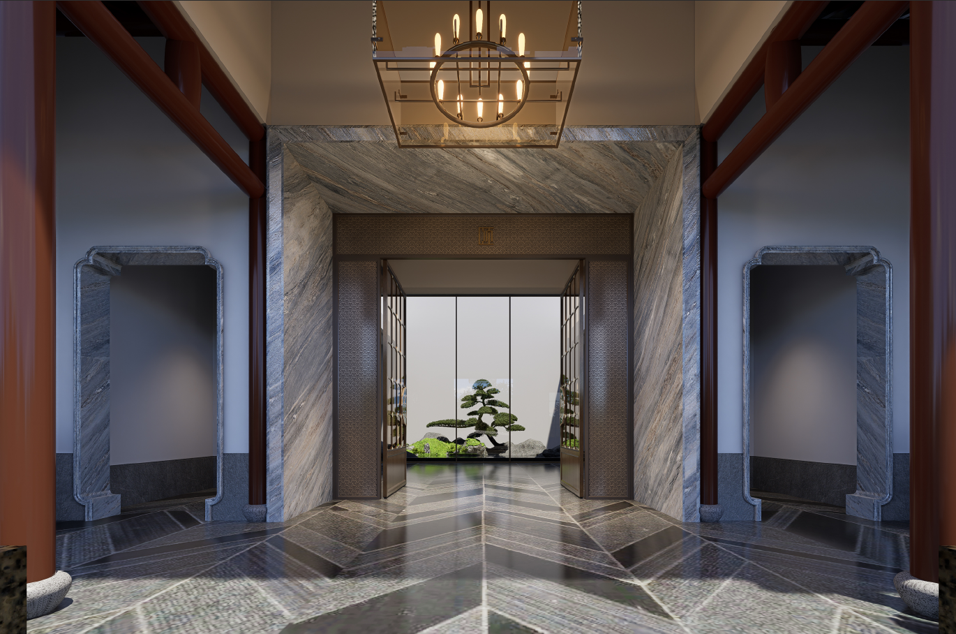 酒店的整体设计以 “引水琢玉” 为核心理念。设计团队从苏州“水城共生”的城市肌理中汲取灵感,将古典园林的“理水”智慧与东方美学中的“琢玉”匠心深度融合。公区布局承袭苏式园林“一步一景”的造园精神,通过现代材质与光影层次的精妙把控,营造出曲折有致、虚实相生的空间韵律。宾客穿行其间,仿若漫步于一幅立体的江南画卷——水影、石韵、木香、光晕交织,既有古典园林的静谧深邃,又不失当代酒店的开放通透。