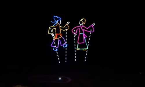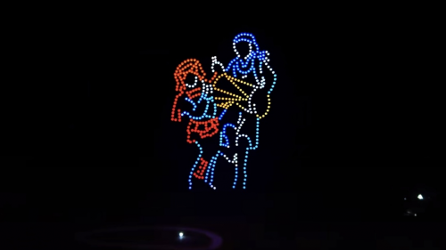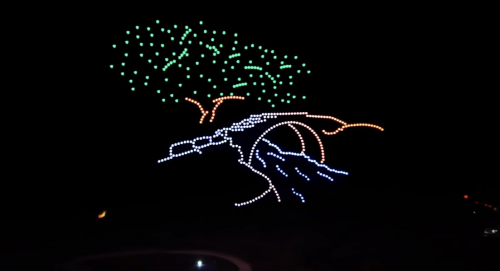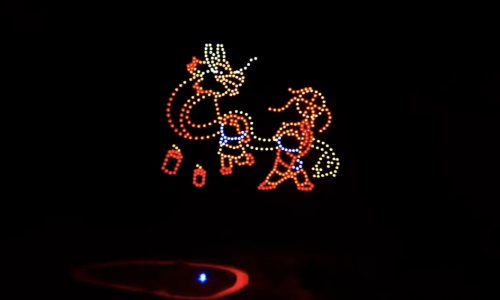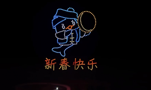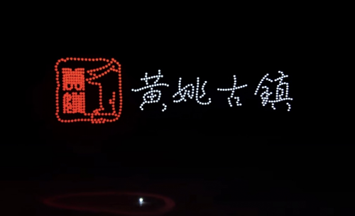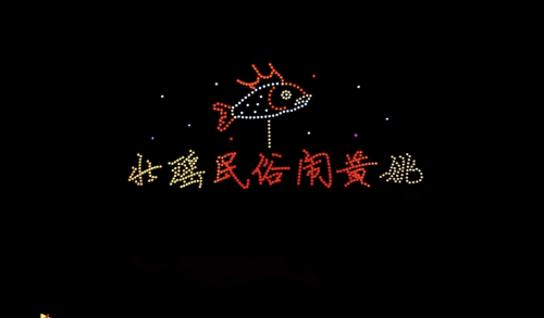 随着指令下达,500台无人机整齐升空,在黄姚古镇的夜空缓缓舒展身姿,拉开光影盛宴的帷幕。泛美智飞的专业执行团队凭借精湛的操控技术,让每一台无人机都精准走位、默契配合,灯光交织间,一幅幅极具特色的光影画面在夜空次第绽放——灵动的鱼龙造型栩栩如生,复刻着黄姚非遗鱼龙节的热闹场景,呼应着“鱼龙舞马贺新春”的活动主题;古朴的古镇轮廓清晰浮现,青砖黛瓦、小桥流水的意象被光影定格,将黄姚的千年古韵展现得淋漓尽致;马年吉祥图案灵动流转,“新春快乐”“福满黄姚”等暖心字样缓缓浮现,传递着浓浓的新春祝福;还有壮瑶民族元素点缀其间,与古镇的民俗氛围完美融合,勾勒出一幅“古韵藏烟火,科技贺新春”的绝美画卷。