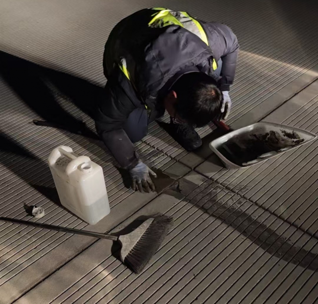 为不影响春运正常通航,机场场道维护队伍化身“深夜修护师”,抢抓夜间停航的宝贵时间,对跑道病害区域开展紧急修补。蹲身清理、凿除松散、精准填补、密封加固,在低温的夜色里,工作人员一丝不苟,用专业与坚守修复每一处破损,用细致作业筑牢飞行安全的第一道防线。