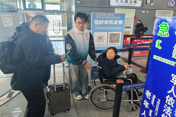 (图:大学生志愿者引导特殊旅客过检)