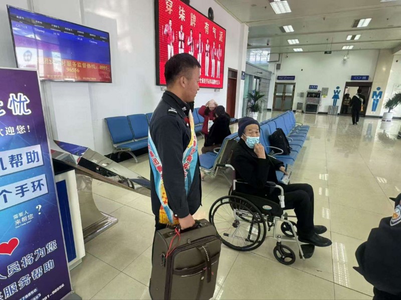 针对返程旅客行李多、特殊群体出行不便等特点,安检站启动高峰保障模式,科学调配人力,动态优化安检通道。安检志愿者主动延伸服务触角,在待检区、安检口等关键点位,为携带重物的旅客提拿行李,为行动不便的老人、轮椅旅客提供“一对一”全流程帮扶,从证件查验、行李过机到引导登机,全程贴心陪护。