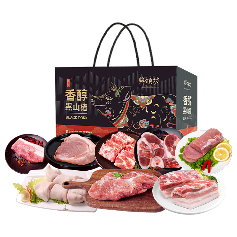 B款:黑山猪肉排骨500g*1份、黑山猪梅花肉500g*1份、黑山猪五花肉500g*1份、黑山猪精选肉500g*1份、黑山猪腿肉500g*1份、黑山猪通脊肉500g*1份、黑山猪肘子肉500g*1份、黑山猪猪蹄500g*1份。