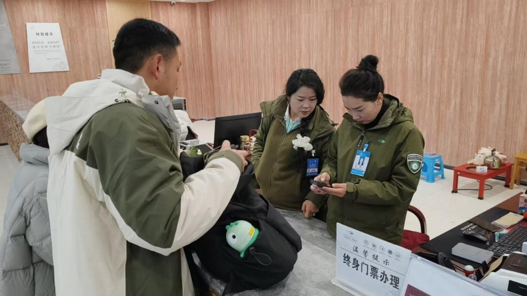 “终身门票今天开始执行了,游客入园后我们会主动提醒游客注意景区游览须知,为游客主动指引路线,让游客感受到终身门票不只是一张门票,更是一份长久的情谊和信任。”海螺沟景区旅游服务中心售票人员杨亚丽说。