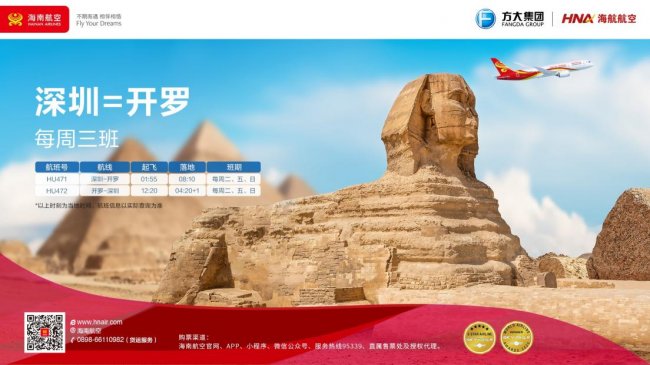 据悉,深圳—开罗国际航线每周执行三班,去程及回程班期均为每周二、周五、周日。去程航班HU471计划北京时间01:55从深圳宝安国际机场起飞,当地时间08:10抵达开罗国际机场;返程航班HU472计划当地时间12:20从开罗国际机场起飞,北京时间次日04:20抵达深圳宝安国际机场。以上航班信息均以购票时实际查询为准。旅客可通过海南航空官网及APP、微信公众号及小程序、服务热线95339、各直属售票处及授权代理查询购票。此外,海南航空还提供预付费行李、机上升舱、商务套票等多元化产品,满足不同旅客的出行需求。