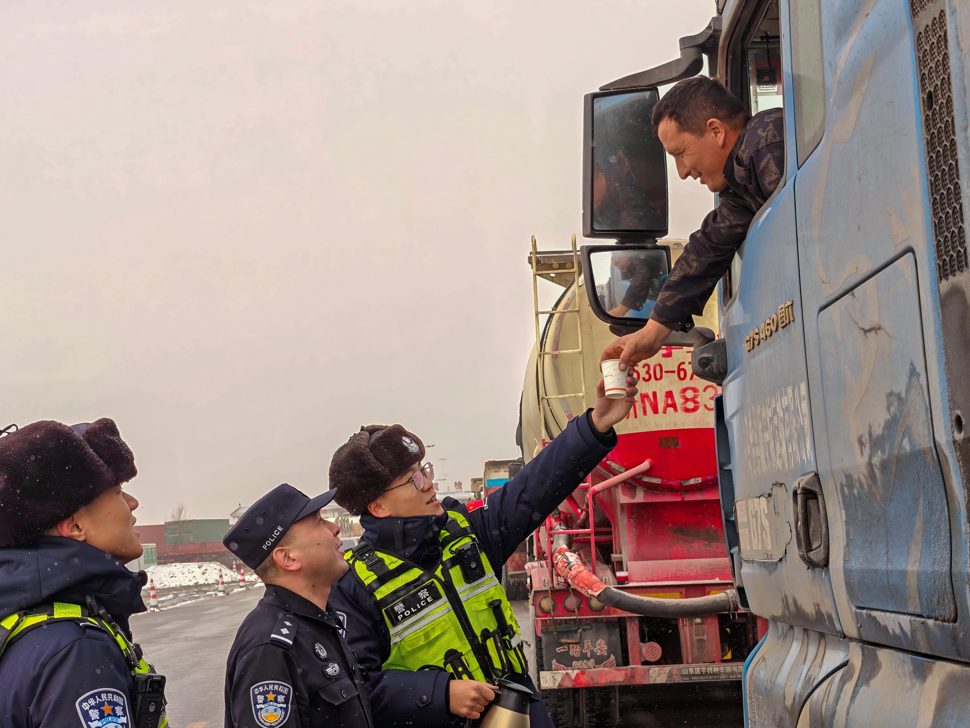 面对突发情况,检查站值班长第一时间带领民警启动应急处置措施,一边安抚滞留群众情绪,一边为大家送去一杯杯温热的茶水,缓解严寒带来的不适。同时,民警逐一向滞留司机、群众做好行车风险提示,详细告知道路结冰注意事项,叮嘱大家耐心等候,遇到车辆故障、物资短缺等任何困难,及时与检查站民警沟通求助。
