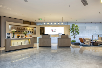 “去酒店化”是其空间策略的核心。在宜尚酒店南京新街口地铁站德基广场店,传统酒店泾渭分明的接待区、社交区、休闲区被打破,取而代之的是一个以开放式岛台为中心的复合空间。岛台打破了前台与客人的物理隔阂,入住办理变得轻松随意;岛台一侧是咖啡区与好物展示区,另一侧则延伸为社交休闲空间。面前超大LED屏倾泻极光流动光影,空间边界消融后,一种类似“本地朋友客厅”的氛围自然浮现。