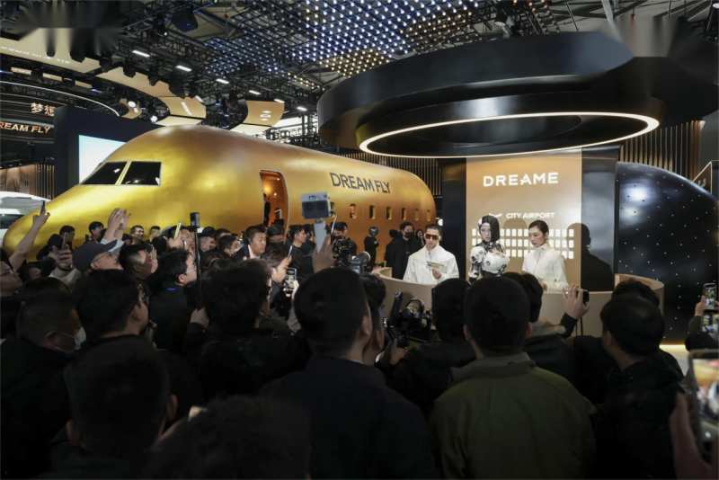 值得关注的是,本届展会着力打破消费电子与高端航空出行领域的行业壁垒,推动跨界融合创新落地。新锐高端航空品牌——梦想航空(DREAM FLY)首次参展即引发行业广泛关注,其展出的通体鎏金概念客机机身成为展会现象级展品,沉浸式全场景体验展区日均接待专业观众及普通访客超25000人次。