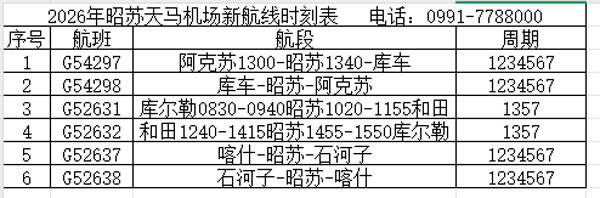 中国航空旅游网讯www.cnair.com 为深入贯彻落实交通强国战略,持续完善新疆支线航空网络布局,满足广大旅客多元化出行需求,助力昭苏县文旅产业与区域经济高质量发展,记者从昭苏天马机场获悉,自2026年3月29日起,机场将正式开通多班疆内环飞航班,标志着昭苏空中交通枢纽建设迈入新阶段。