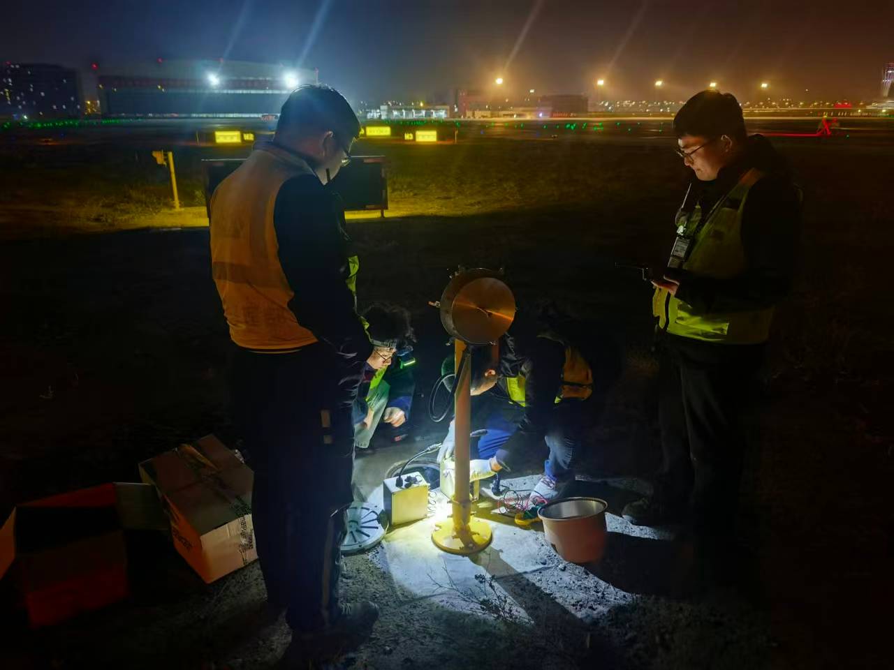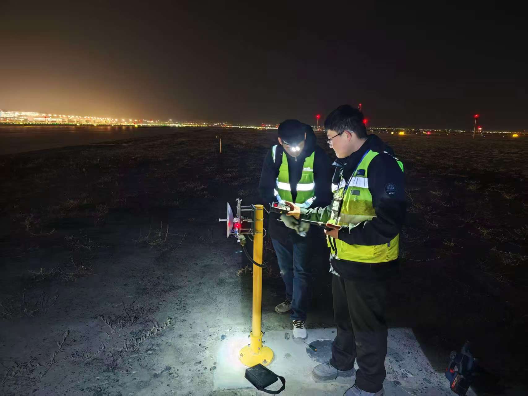 考虑到不影响航班正常运行,测量工作均安排在航班间隙及夜间窗口期开展。工作人员身着反光背心,携带设备沿跑道两侧逐灯作业,弯腰核对灯具编号、精准架设仪器、读取角度数据、记录参数偏差,每一个步骤都严格对标民航行业标准。对发现角度便宜超标的灯具,工作人员当场启用备用工具进行微调,调整后立即复核数据,直至角度完全符合安全要求,实现“测量即发现、发现即整改”。