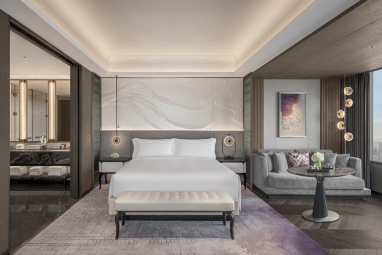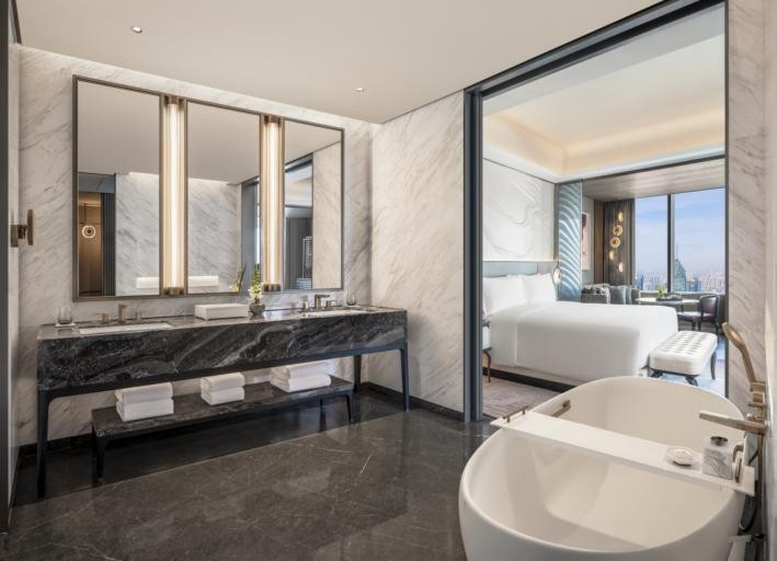 作为武汉越秀国际金融中心的核心高端配套,武汉丽思卡尔顿酒店踞守项目46至59层,与综合体超甲级写字楼、高端商业实现空间互补、体验联动,以330米的云端高度俯瞰两江交汇,将荆楚千年文脉与丽思卡尔顿传奇服务相融,为全球宾客、综合体办公及消费客群,打造兼具本土底蕴与国际水准的全场景沉浸式体验,实现“办公、消费、旅居、社交”的无缝衔接。
