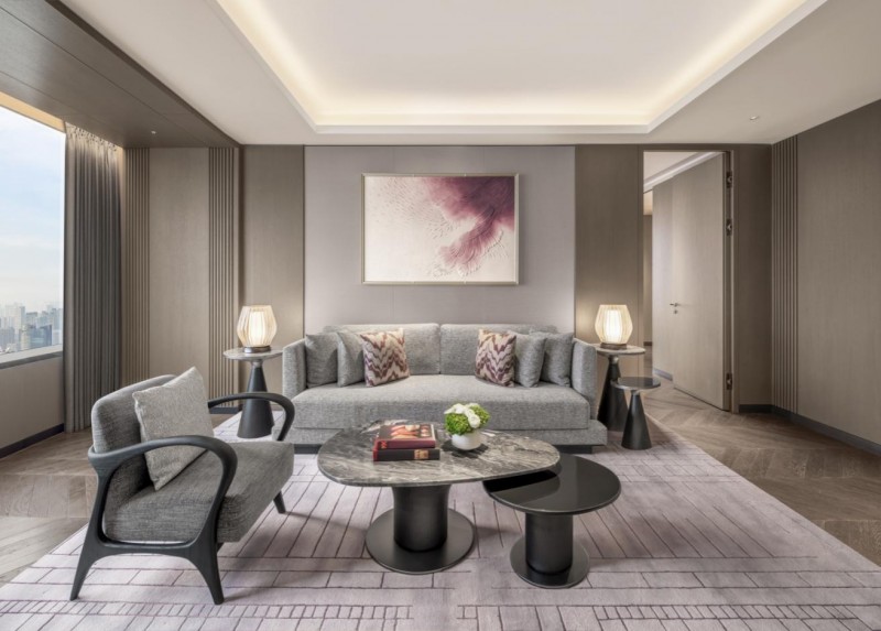 酒店由伦敦KCA国际事务所与深圳CCD郑中设计事务所两大顶尖团队联袂操刀,以“流光楚韵”为设计核心,将武汉江河交汇的城市气韵与楚地文化精髓转化为当代空间语言,成为综合体极具辨识度的文化标识。流畅线条勾勒江水灵动之态,层叠材质彰显楚文化的含蓄典雅。东湖烟雨的静谧、云梦泽境的生机、编钟礼乐的历史回响与楚舞纹样的当代演绎,交织于空间细节之中,引领宾客在光影与艺术之间展开一段以“鸿鹄东来”为主题的云端艺旅。
