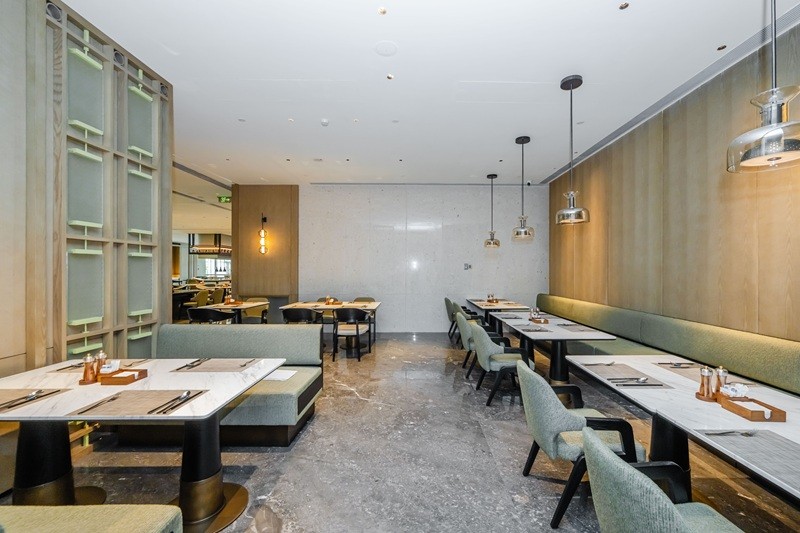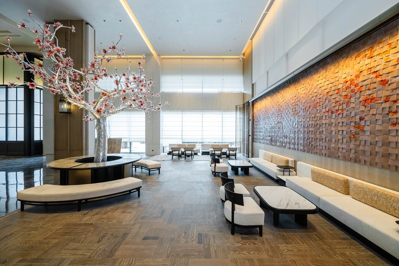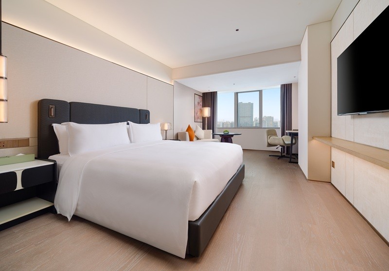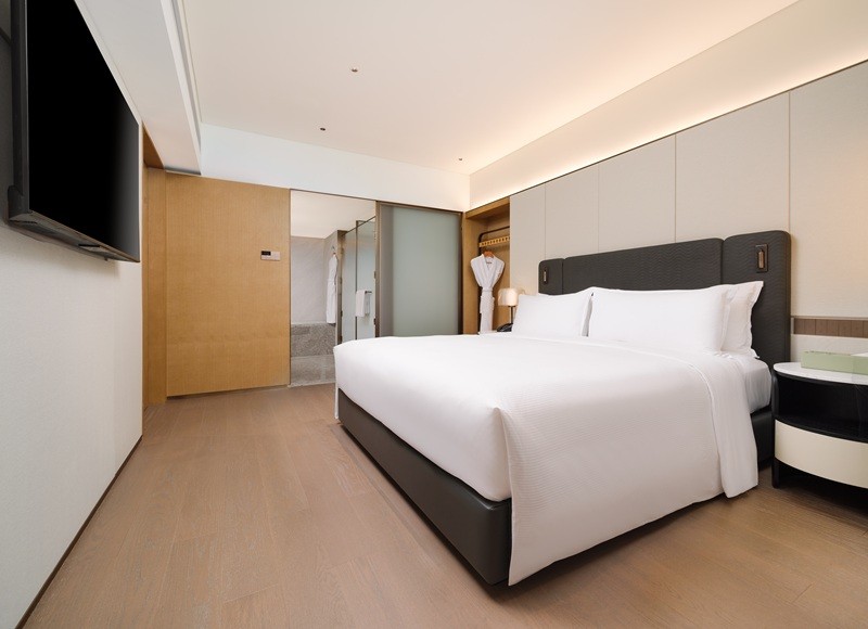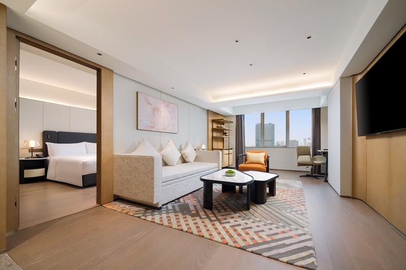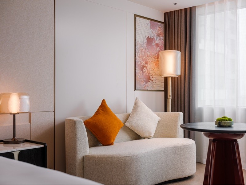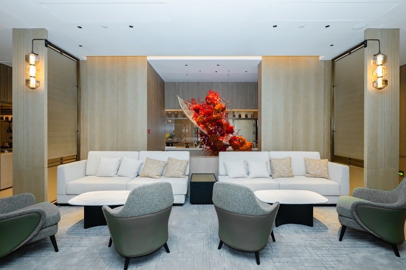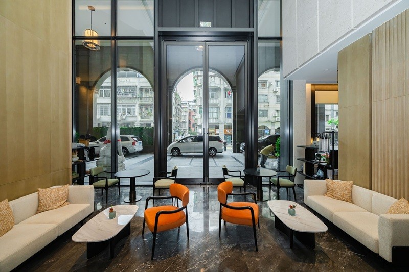 北大堂的木棉花屏风太惊艳,用细腻工艺复刻出花城盛放的模样,阳光洒下来,花瓣仿佛都在发光;南大堂挑高7.5米,片墙设计勾勒出岭南骑楼的廊道感,大堂吧连着户外花园,坐在这里喝茶聊天,抬头就是绿植与光影,惬意又出片。客房走廊藏着小巧思,高低错落的天花模拟老广州天井的光影,墙面隐约印着北京路古街地图,走在里面像在翻阅一本立体的城市绘本——这些设计都源自越秀商管对在地文化的深度挖掘,让老建筑的肌理与现代生活无缝衔接。