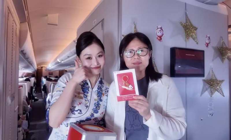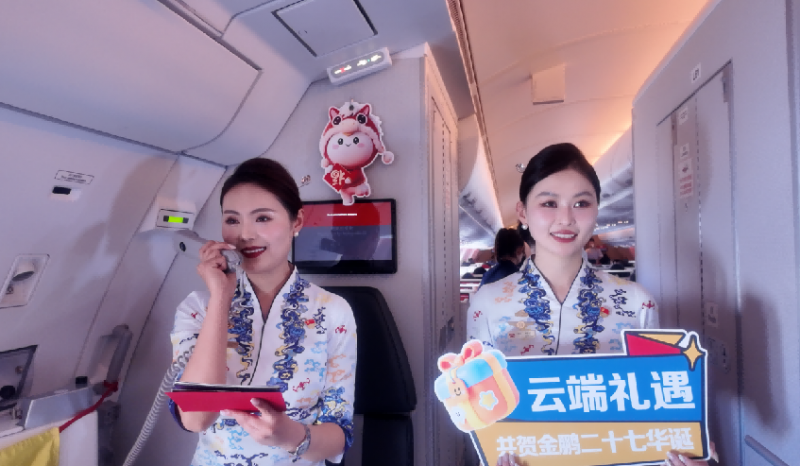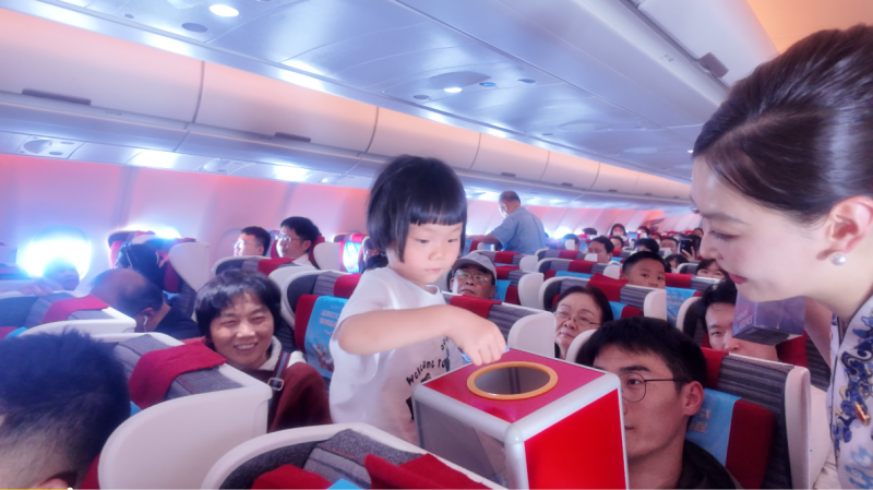 航班平稳飞行后,HU7281航班化身“时光专机”,在万米高空举行“金鹏廿七载,骐骥跃新程”主题航班活动。客舱内,乘务员以一段温暖的广播致辞拉开序幕:“各位旅客朋友们,欢迎搭乘‘金鹏廿七载,骐骥跃新程’主题航班,很荣幸与各位共庆金鹏俱乐部27周年……”随后进入活动有奖问答环节,乘客们围绕金鹏俱乐部成立年份、27周年主题等题目踊跃抢答,客舱内发出阵阵掌声和笑声,气氛热烈高涨。